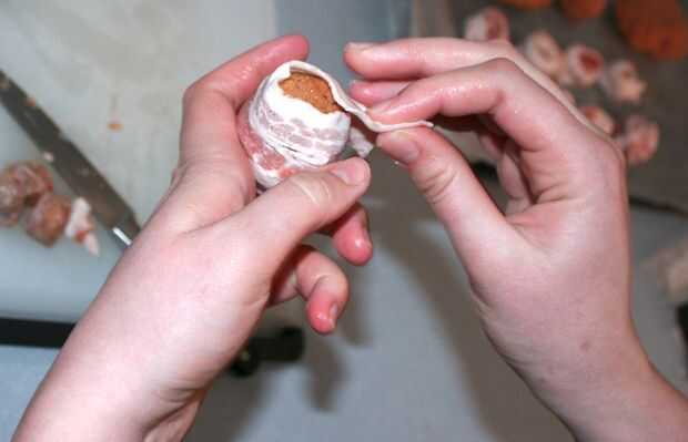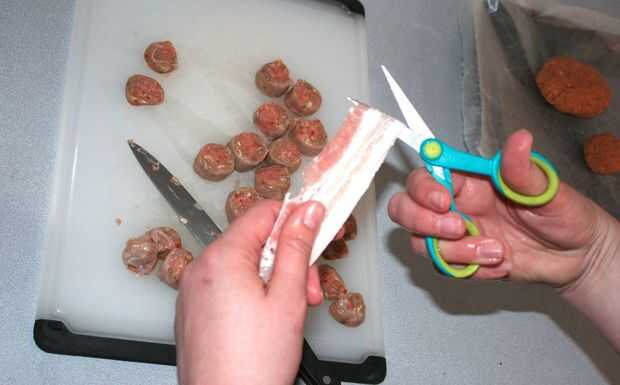 Tomar algunos tocino y empezar a envolver las hamburguesas y salchichas pies. Trata de cubrir tanto como sea posible. Cuando se coloque en una cacerola.