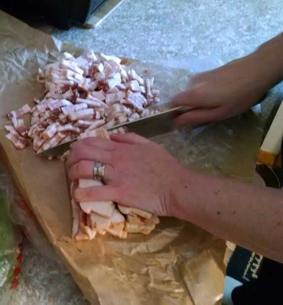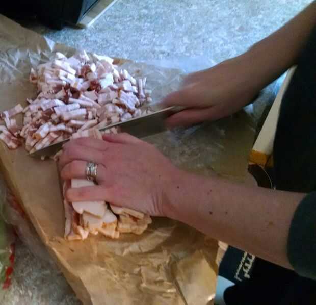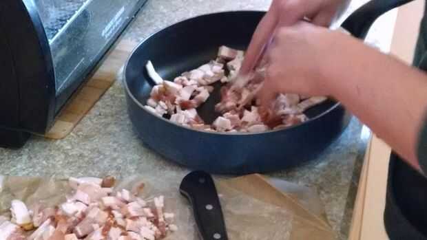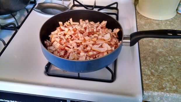 Tomar su bacon y cortar en trozos pequeños. Una vez que han cortado por la libra de carne sabroso pon en la sartén y a fuego medio. Desea el tocino cocido pero no crujiente.