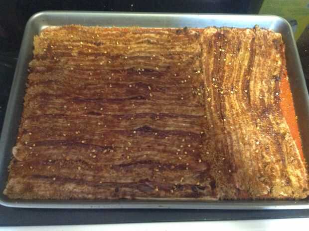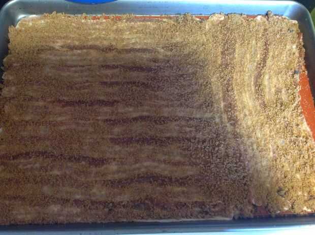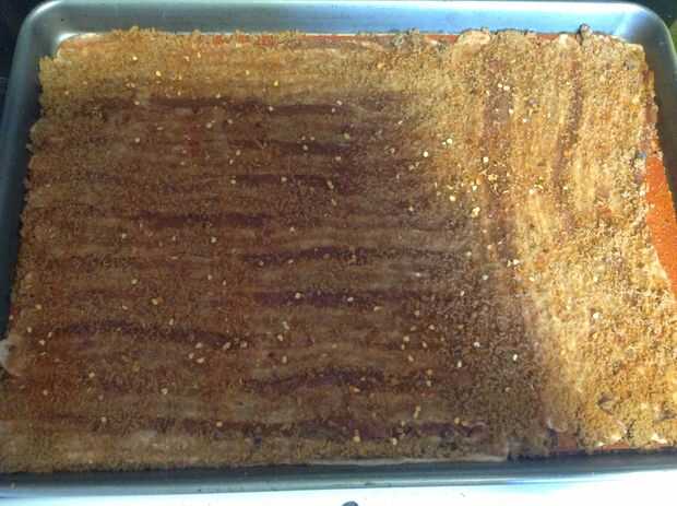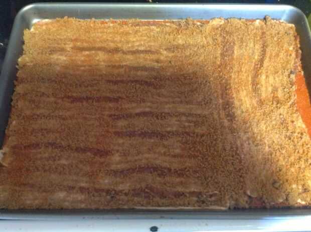 Cubrir el tocino en una capa de azúcar de marrón oscuro, lo suficiente para cubrirla.
