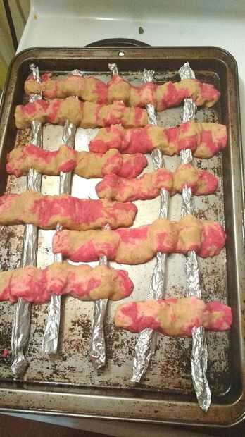 3. Coloque un pedazo de papel de pergamino sobre los rollos y cuelgue sus tiras de tocino en ellos, fijación en cualquier lugar cae aparte prematuramente (como se ve en fotos). Si no tienes papel de pergamino (como no), simplemente rocíe la bandeja para hornear con aceite, frotar cada pieza de sus hojas de papel de aluminio en este aceite antes de que se enrolle a lo largo, luego rociar todo nuevamente una vez que se realiza. Papel pergamino es básicamente sólo una hoja de papel como de bondad no se pegue. (Pero recomiendo usar papel pergamino como también ayudará a las galletas mantener su forma ya que no tienes que sacar el papel de aluminio rodillos hacia fuera debajo de ellos después de la cocción, usted sólo tome el papel).