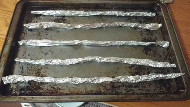 2. hacer la hornada hoja de largo rollos de papel de aluminio (ver fotos). Estos hará que las olas en su tocino cocido.