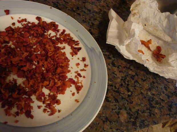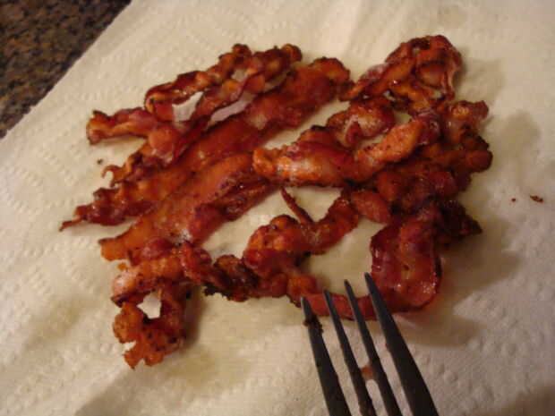 Retirar del fuego y colocar sobre papel toalla y pat seco. Eliminar gran parte de la grasa como sea posible. Dejar enfriar y luego rompen el tocino hasta que tengas trozos de tocino. Como se mencionó anteriormente, la rebanada de tocino entero no se crujiente, así que lo que haces mientras que rompiendo el tocino aparte es eliminar las partes grasas y comerlos: