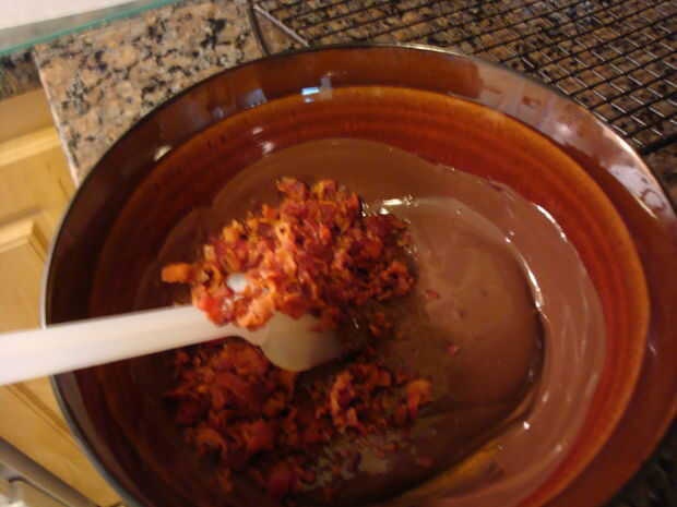 Poner la taza de Chocolate Chips/obleas en un recipiente y coloque en el microondas durante unos 20-40 segundos hasta que se derrita. Añadir el tocino en el chocolate derretido y mezclar hasta combinar.