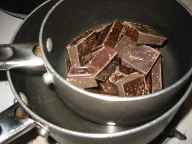 Romper el chocolate y poner un poco en la sartén más pequeña y convertir el calor en medio (evitar balanceo hierve, como lo escupirá agua en el chocolate)