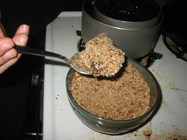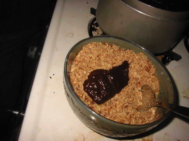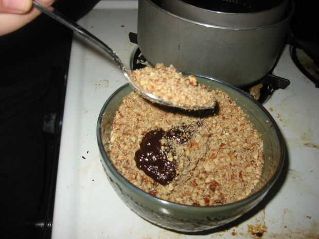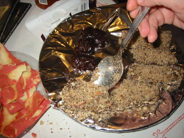 Retire cada pieza de chocolate y colocar en un bol de frutos secos y enróllelo alrededor antes de transferirlas a una placa de aluminio forrado.