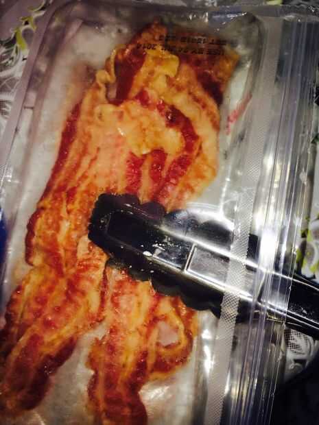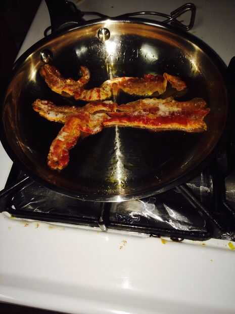 Cuando crees que la sartén está suficientemente caliente y listo para el tocino, poner sobre 3 tiras de tocino en allí.