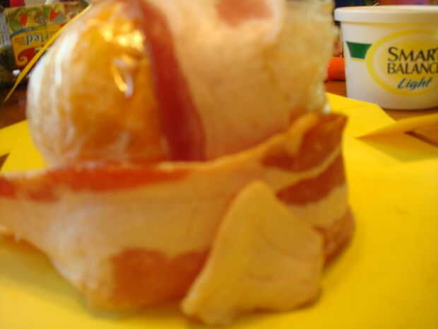 En primer lugar cubre la naranja con envoltura de plástico para proteger la grasa del tocino de forma. Coloque un pedazo de tocino verticalmente en la naranja y una segunda horizontal en la parte inferior de la naranja. Entonces lugar un pedazo pequeño triángulo de bacon fueron que se cruzan.