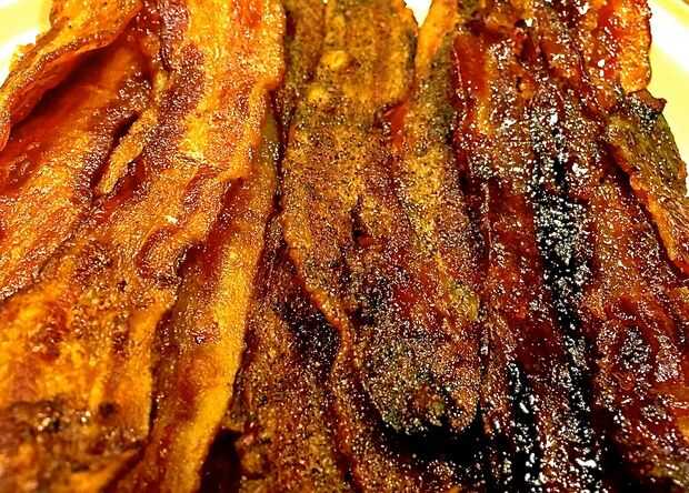 ) )Tratar, de este emocionante nuevo giro en esta clásica receta.Tradicionalmente se sirven los huevos en una tajada de jamón gruesa frío, agregar tocino al horno lento que ha tenido azúcar espolvoreado sobre él, añade una nota de caramelo rico hermo