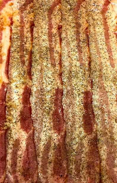 Igual que antes... Coloque las rebanadas de tocino al lado en el enfriamiento, sin dejar de tocino superpuestas. Con pimienta fresca (use Extra Bold indio negro pimienta, puede encontrarse en https://www.penzeys.com/online-catalog/whole-special-extra-bold-indian-black-peppercorns/c-24/p-1427/pd-s). Moler la pimienta encima del tocino.