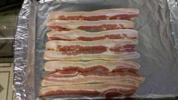 Línea de la bandeja para hornear con papel de aluminio. Lay out el tocino tiras horizontales de lado a lado tan juntos como sea posible.