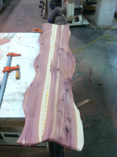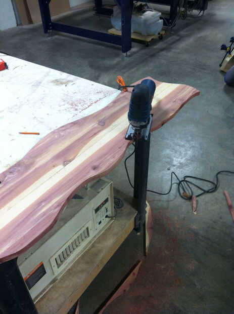 Después el pegamento haya secado corte la forma de su tocino. Llamo a una línea de lápiz sobre la forma general que quiero. Luego fíjela a una mesa o Banco de trabajo y uso que un jig Sierra para cortar hacia fuera. No te preocupes si pierdes tu línea por dos razones. 1) no de tocino, realmente no tiene una forma exacta, 2). Eres la única persona que sabrá si te perdiste el hilo de corte exactamente.