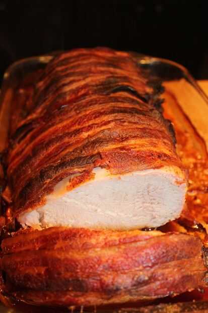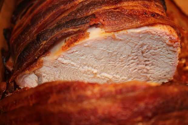 Oh mi Yum! Esto es algo que hacen bastante regularmente. Así de Simple!Paso 1: Prepárese Conseguir un lomo de cerdo (encontré uno que fue previamente marinado en Borbón y jarabe de arce!!! Santa mierda!!!)Colocar varias rodajas de tocino debajo de él