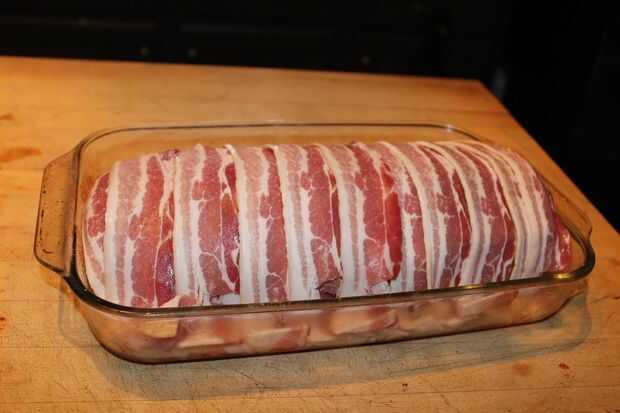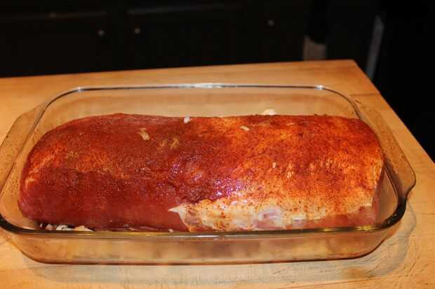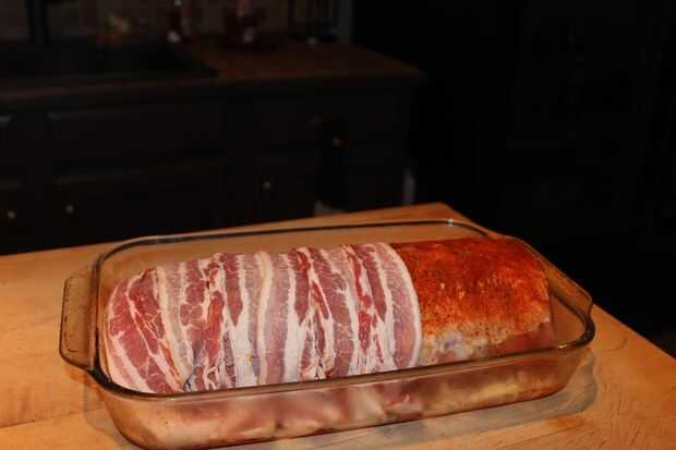 Frotó el lomo con una frotación de parrilla comprada de tienda y lo colocó en una bandeja para hornear de vidrio. A continuación, había forrado el lomo de cerdo con tocino.