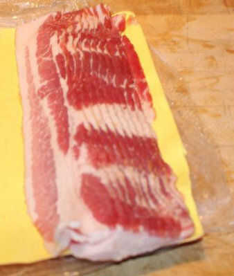 Oh mi Yum! Esto es algo que hacen bastante regularmente. Así de Simple!Paso 1: Prepárese Conseguir un lomo de cerdo (encontré uno que fue previamente marinado en Borbón y jarabe de arce!!! Santa mierda!!!)Colocar varias rodajas de tocino debajo de él