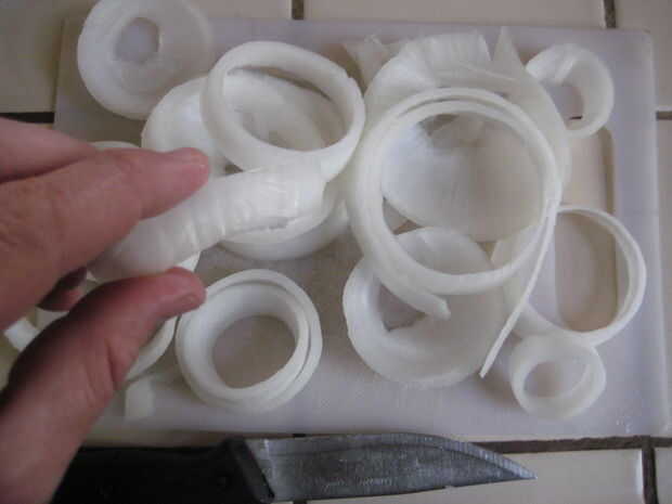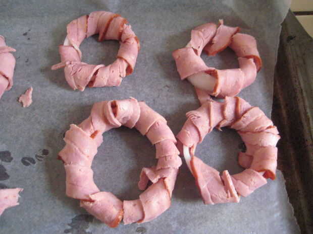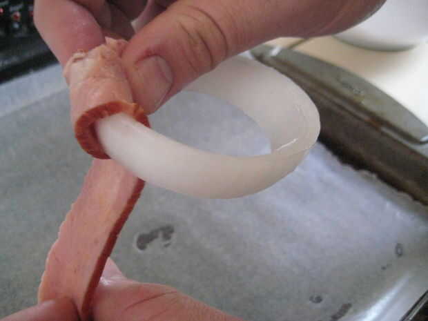 3. empezar a envolver aros de cebolla con tocino tan estrecha como sea posible sin dañar el tocino.