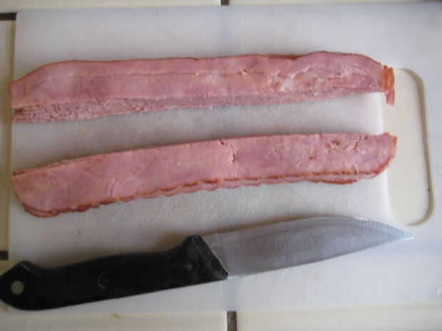 2. Si usas tocino en rodajas gruesa, puede cortar por la mitad (forma larga) así que envolverá a la más fácil.