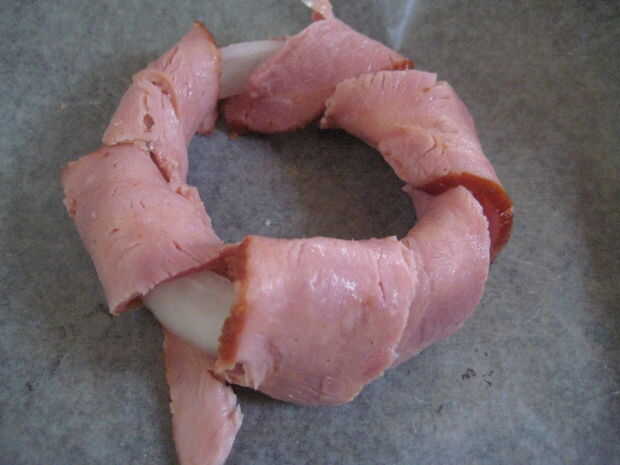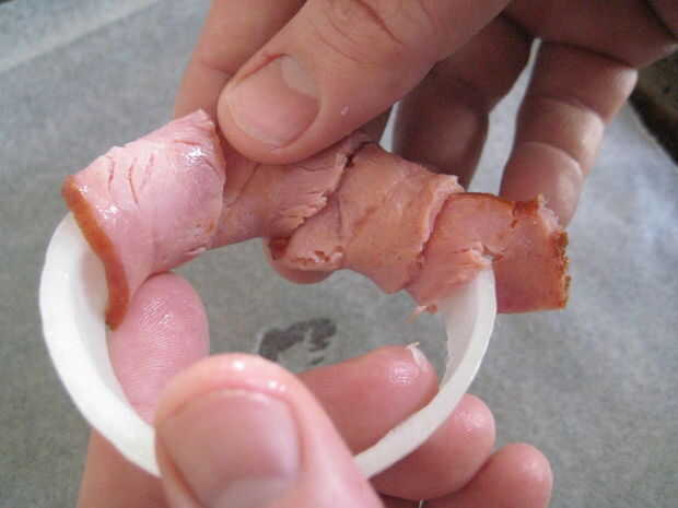 proceso hasta que el anillo de cebolla es totalmente envuelto en tocino.