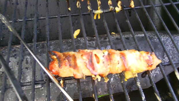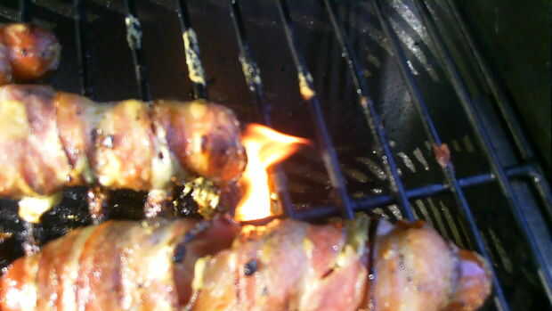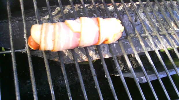 Coloque con cuidado el tocino salchichas envueltos en la parrilla usando las pinzas.