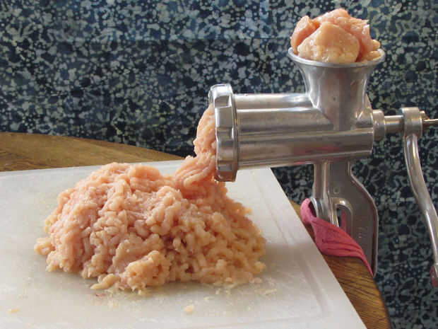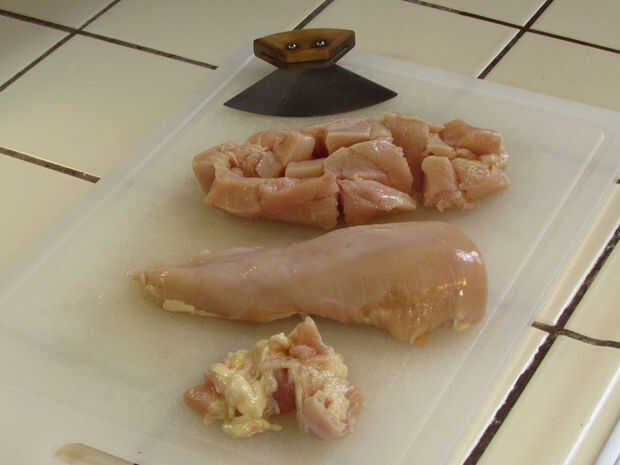 1. Si se muele la carne por usted mismo, recortar toda la grasa y las imperfecciones de su pollo, luego cortar las pechugas en trozos grandes.