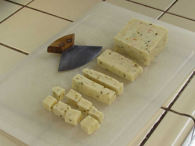5. cortar el queso en cubos de aproximadamente el mismo tamaño como sus anillos de jalapeño.