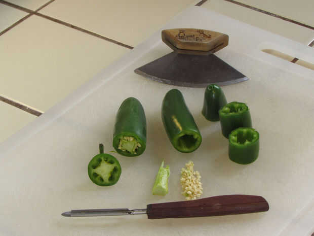 3. cortar las copas de los jalapeños y base de los centros y cortar tus pimientos en sobre anillos de espesor de pulgada.