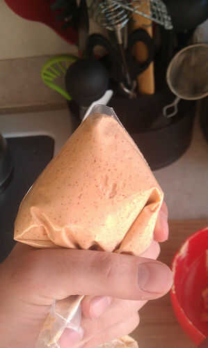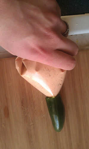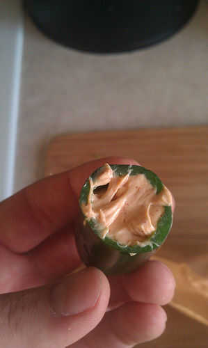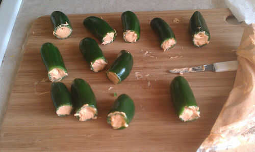 Poner el relleno en la bolsa ziploc y cortar una de las esquinas inferiores o coloque en la Manga pastelera. Con la punta de la bolsa en la pimienta, apriete hasta que el relleno alcance la parte superior. Repita hasta que se rellenan los pimientos.