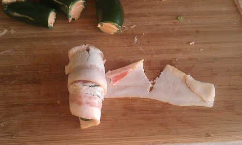 2. Pelar una tira de tocino apagado y garb uno de los pimientos rellenos.