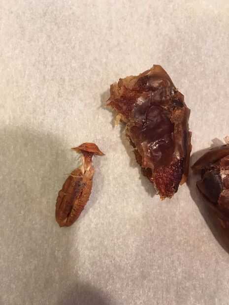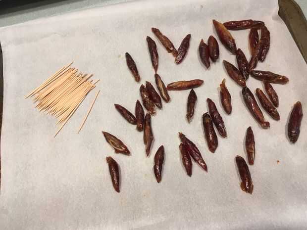 1. Convertir las fechas a la mitad. Retire y deseche el hoyo (y posiblemente la madre). Corte las mitades por la mitad. Debe tener 40 piezas de fechas.