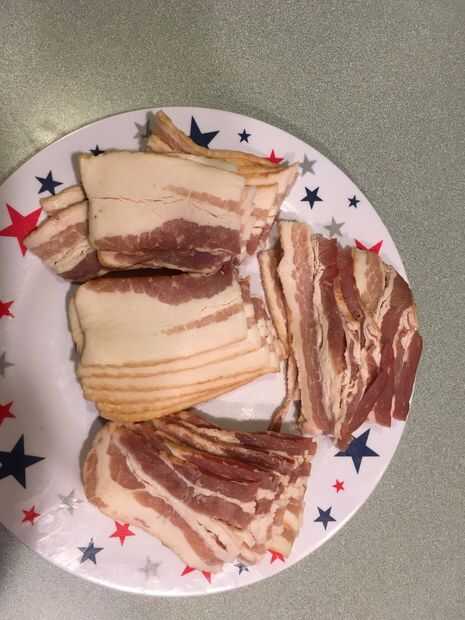 1. Cortar el tocino en 4tas (haciendo 40 bacon tiras de aproximadamente 2 pulgadas)