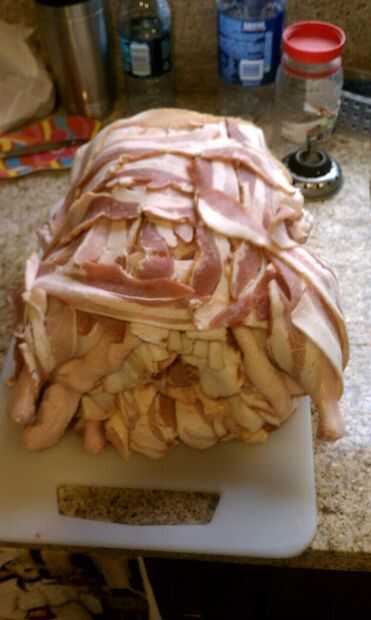 Estas aves eran tan grandes que tenía que cortar el pavo para llegar a la cavidad para abrir lo suficiente para conseguir todas esas aves que en él, sólo abrigo firmemente el tocino alrededor de las aves, o si desea cerrarla con guita de los carniceros.
