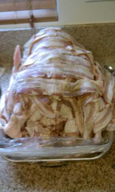Ahora aquí es una opción de cocina para que usted pueda hacer, o bien puedes poner las aves en el horno como he mostrado (mama lado hacia arriba), o se puede cocinar pechuga hacia abajo. Yo recomiendo que usted cocine pechuga hacia abajo porque la carne blanca es normalmente seca y con él pechuga hacia abajo se adobo/cocinero de toda esa grasa de tocino buena que va a gotear en la parte inferior de la bolsa.