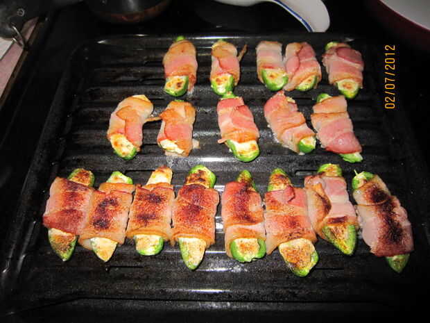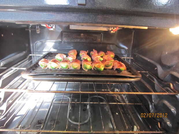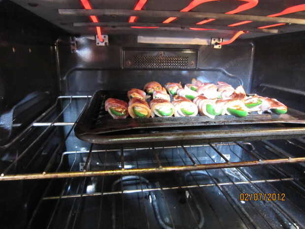 Diez minutos parece que funcionan mejor en mi horno, tuyo puede variar. Las tapas del tocino un poco crujientes, los lados están bien hechos.