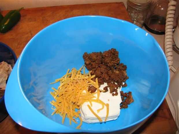 En un tazón pequeño combine el queso crema, carne de taco, queso rallado y una pizca de ajo granulado. También se puede utilizar 1 diente de ajo fresco machacado.