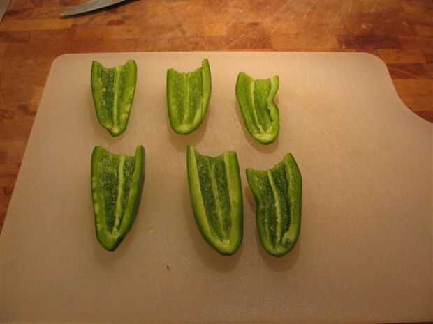 Lavar y secar los pimientos. Cortar el extremo de cada pimiento y luego longitudinalmente. Quitar las semillas y membrana.