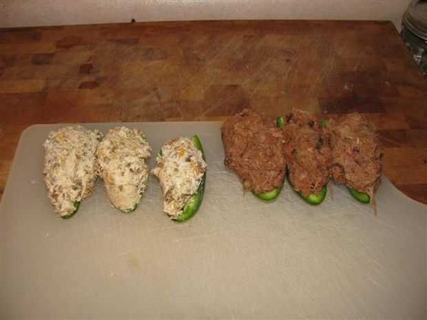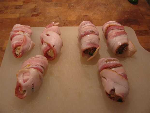 Ahora envolver cada pimiento relleno con una rebanada de tocino. Me gustaría empezar por colocar el extremo del tocino en el extremo de corte abierto de la pimienta y envolver alrededor de la pimienta hacia el punto. Hecho correctamente se debería ser suficiente para la vuelta al final del tocino sobre la parte superior. Puede utilizar palillos para sujetar el tocino en su lugar. Evitar utilizando palillos de dientes con sabor o de colores para ello.