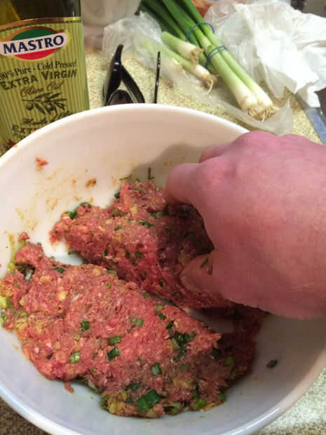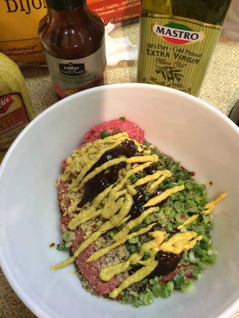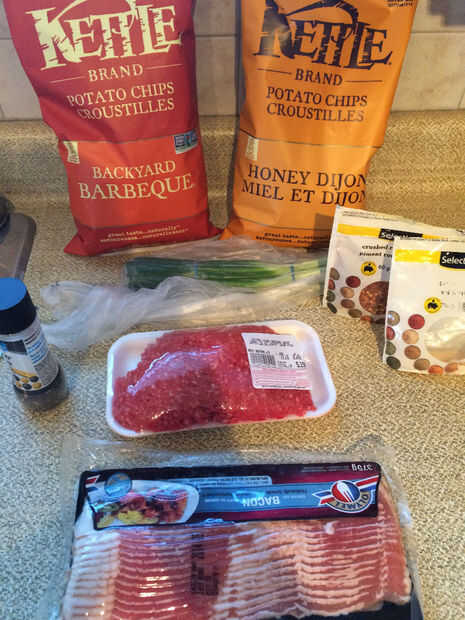 Combinar los primeros 8 ingredientes en un gran arco de mezcla (la mitad de las virutas de patata trituradas) y mezclar hasta que quede mezclado