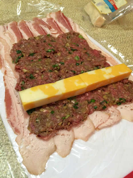 2 - lentamente cuchara carne mezcla el tocino y la propagación hasta casi cubrir dejando algo de espacio en los lados y los extremos para cerrar el rollo.