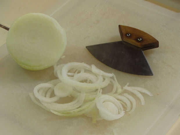 1. cortar la mitad de una cebolla en anillos finos o medios anillos.