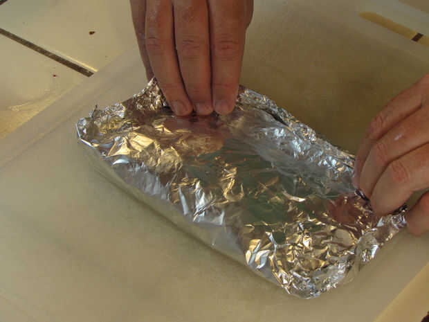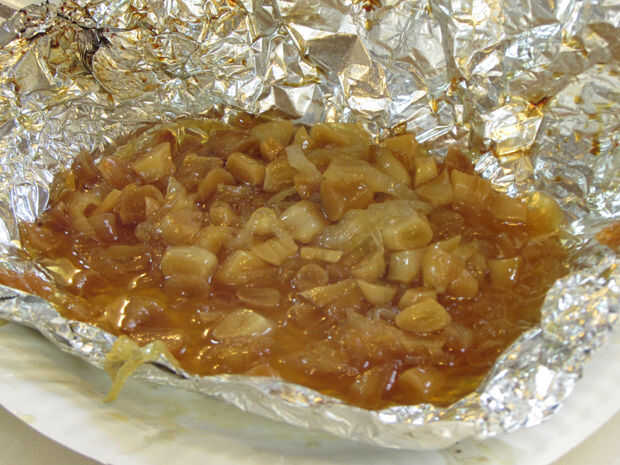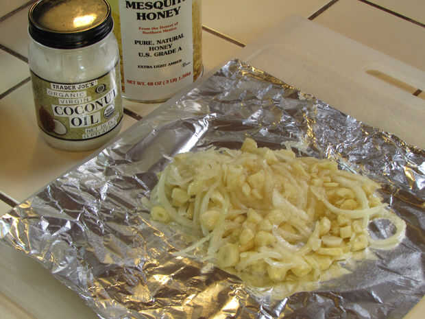 3. Mezcle el ajo y la cebolla con la miel y el aceite de mantequilla, luego coloque la mezcla sobre un pedazo grande de papel de aluminio. Doblar los bordes hacia arriba para que ninguno de los líquidos puede fundir hacia fuera y usted puede abrir fácilmente para comprobar cosas si fuera necesario.