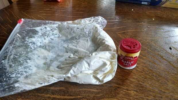 Amasar para suavizar aún más, añadir sal ajo y mezclar bien de nuevo. Agregar un poco de sal de ajo a la vez y probar un poco. Si usted necesita usted puede agregar más.