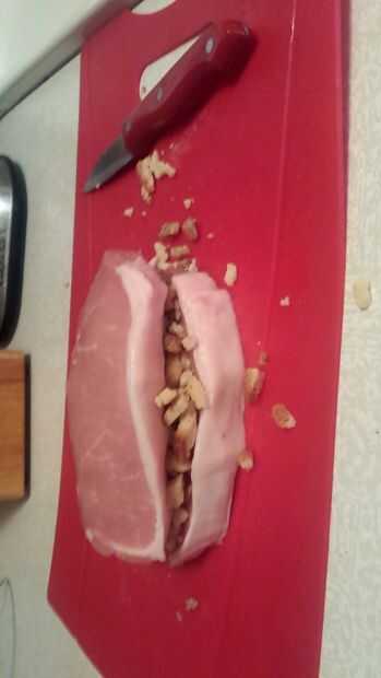 Vierta una buena cantidad de relleno en el porkchop y cierre para arriba!