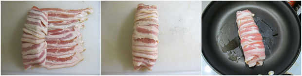 Ahora quieres envolver el salmón con bacon realmente apretado, comience con un lado.