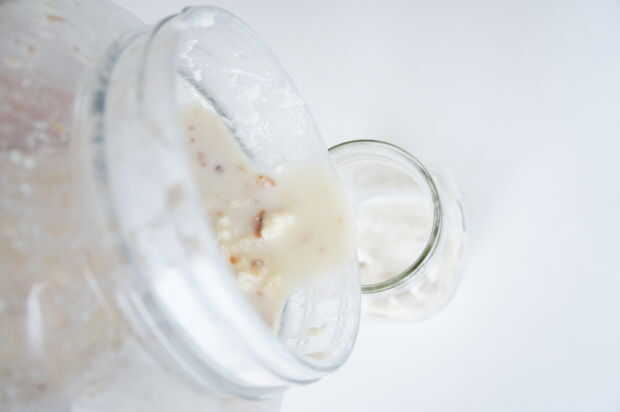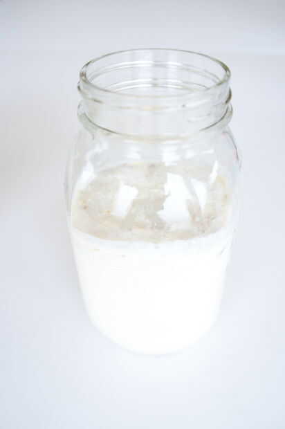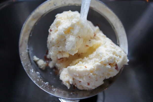 El líquido claro es suero de leche. Cuele el suero de leche en un frasco y guárdelo para panqueques! A continuación, debe quitar todos los residuos de leche o su mantequilla se pondrá rancio. Poner la mantequilla en un colador y correr bajo el agua hasta que el líquido sea claro. El líquido será nublado al principio. Tarda unos minutos, asi que tengan paciencia.