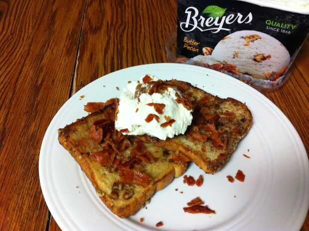 Lugar cocinado torrija en placa. Encima con la cucharada de helado. Espolvoree pedacitos de tocino y a la izquierda sobre las nueces en la parte superior. Salpicar el bacon salsa de Carmelo sobre todo. Tomar un bocado del cielo!!!!!!