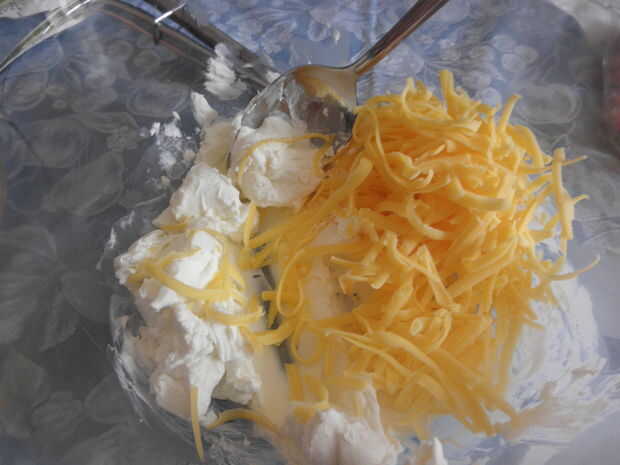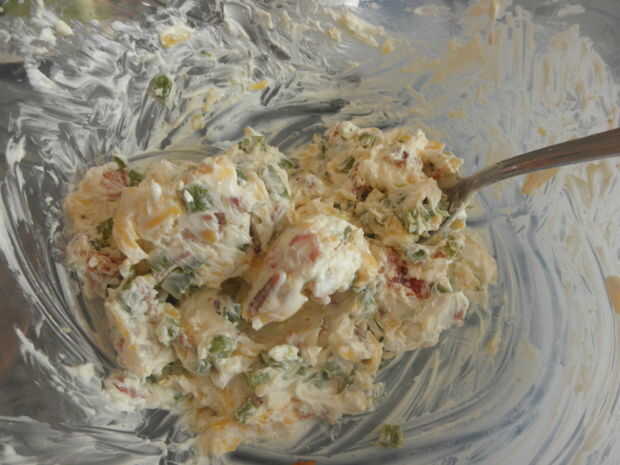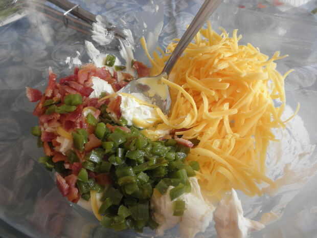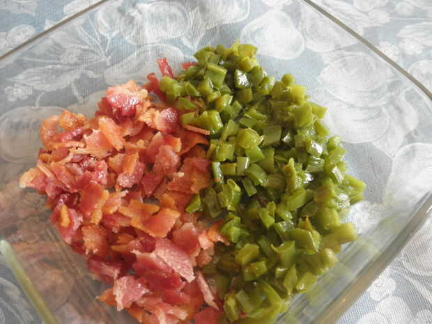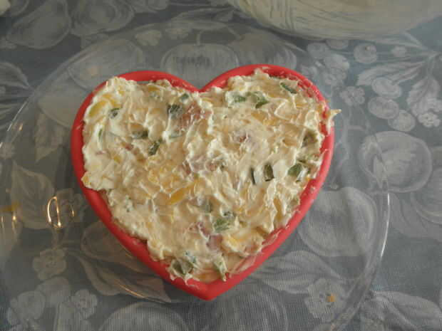 Deje que el bacon y jalapeños enfriar y dados para arriba. Al queso crema ablandado y añadir el queso rallado. Mezclar bien. Rocíe su cortador de galletas grande con spray pam para que la inmersión forma sale muy bien. Utilizar la cuchara para empacar la mezcla en el cortador. poner en el congelador durante 10 minutos y luego suavemente Levante la herramienta de corte para revelar su dip de snack en forma de corazón lindo. Mantenga refrigerada hasta listo para comer. Una vez que no tardará mucho para que desaparezcan.
