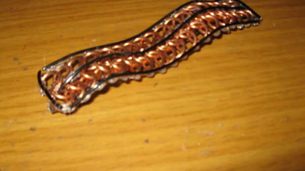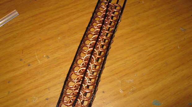 En este paso se acabará el tocino. se necesita hilo para hacer los bordes de la panceta (utilicé hilo negro, pero puede utilizar cualquier cable) tome el pedazo de cota de malla y junte hasta que se parece a la imagen. luego cortar las piezas de alambre a la misma longitud que el trozo de cota de malla. Luego pegamento caliente los trozos de alambre de los bordes para hacer que mantenga su forma. Luego pegar otro trozo de alambre en los otros bordes y un par en la parte posterior. Poner una pieza más del alambre por la mitad de la frente. Finalmente usted puede doblar el alambre para que se vea más como bacon.