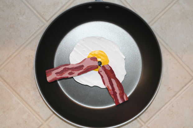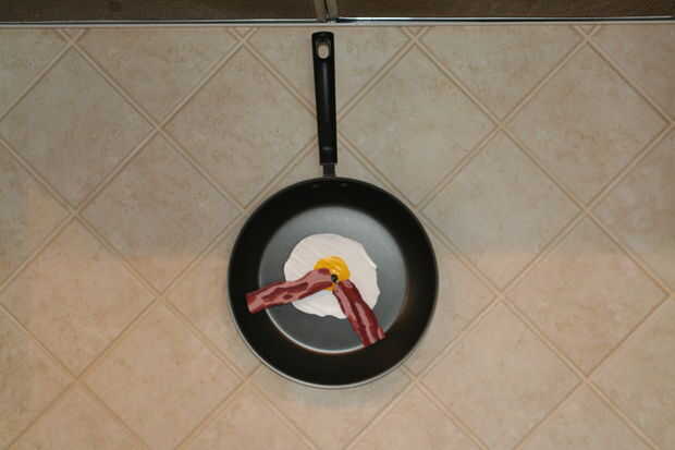 ADVERTENCIA... no para la gente en una dieta.Utilicé los siguientes:BaconquesoJamón ahumado en rodajas fina3 huevosPaso 1: Se necesita una sartén con una tapa.Primero derrita la mantequilla. Entonces ponga el tocino en. Dejarlo rizo y darle la vuelta