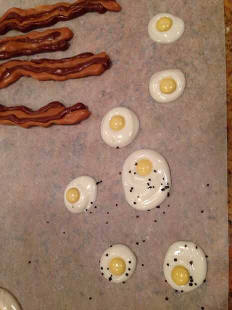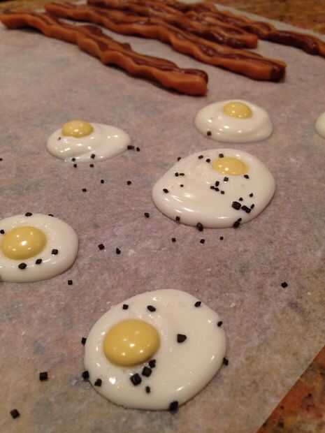 Colocar las galletas sobre papel de cera. Derrita el chocolate. Sacar una cucharada de chocolate de galleta y parte inferior de la cuchara para distribuido uniformemente alrededor de la galleta. Pala otra cucharada de chocolate y extensión alrededor hasta que se asemeja a un huevo. Colocar caramelo amarillo al lado de la galleta en el chocolate. Espolvorear de azúcar/chispitas de blancos y negros.