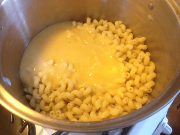 BlamCo Mac & Cheese de Fallout. Super fácil de hacer! Sólo necesitas una sartén para hacer esto, perfecto si están acarreando toneladas de engranaje en el yermo.3 1/2 tazas de agualeche evaporada de 12 onzas3 tazas de coditos1/2 cucharadita de sal1 c