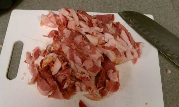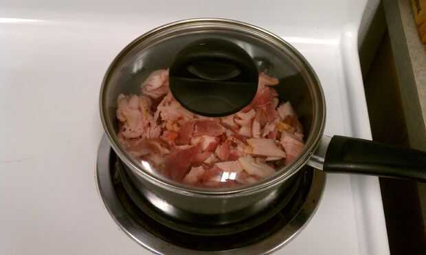 Sólo usé aproximadamente 1/3 de la panceta en ese paquete, sobre una libra. He picado tan pequeños como sea posible y lanzó en un bote para empezar a cocinar. Puse la olla a fuego medio y había cubierto hasta que el tocino era marrón agradable y crujiente.